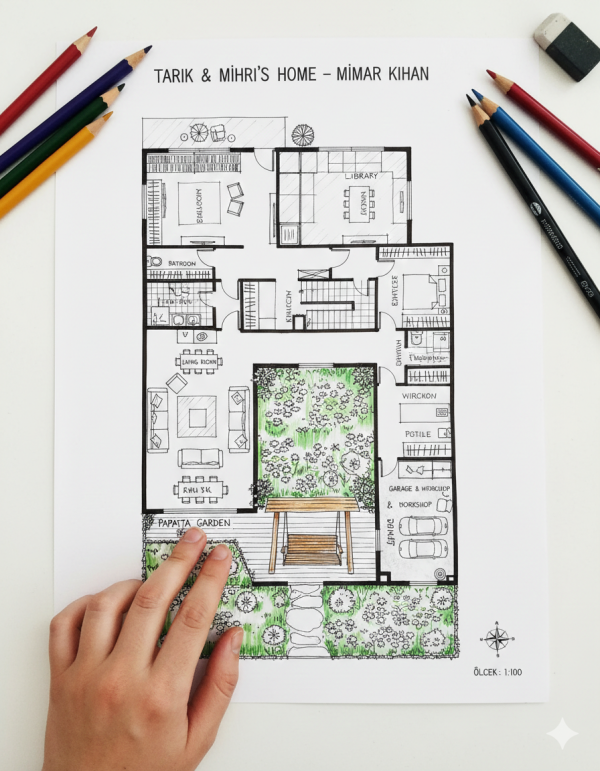 Daha önce hiç bir ev krokisi incelememiştim ama Tarık’ın attığı görsele bakarken kendimi yine hayallere dalmış bir vaziyette buldum. Görseli büyüterek her ayrıntıyı tek tek inceledim. Anlattığım tüm detaylar oradaydı: Kütüphane, bahçe, garaj, o geniş pencereli Amerikan mutfak...