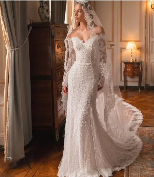 Gelinliğim omuz detaylı koltuk altımdan başlayan dantel kolları vardı. Kalp yaka ve göğüs bölgesinde küçük dantel işlemeleri balık modeli olan dantelli gelinliğimin içinde çok güzel duruyordum.
