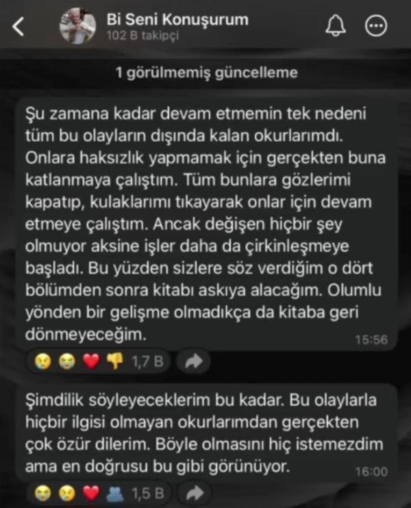 Yani kitap bir süre yazılmayacak Metin bile yazamayan insanlar Maral atmacaya laf ediyor kadinda isini yapiyor buyuk bir kitlesi var bir suru kitabi basıldı geliptr böyle konusamazlar Yanan Sarkaç'a bölüm bekleyen biz olduk