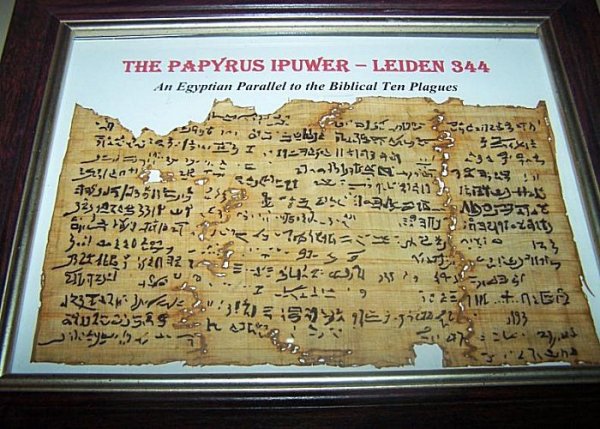 Hollanda'daki Leiden Ulusal Müzesi'nde sergilenen Ipuwer Papirüsü (Gerçek resim)
